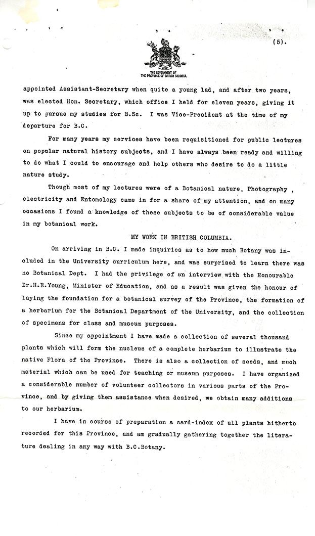 In 1911, a young Scottish botanist named John Davidson (1878-1970) emigrated from Aberdeen to Vancouver hoping to earn a professorship at the newly established University of British Columbia. His first position, however, came as a surprise. The Provincial Secretary at the time, Henry Esson Young, for which Essondale Hospital was named, appointed him BC’s first Provincial Botanist.
