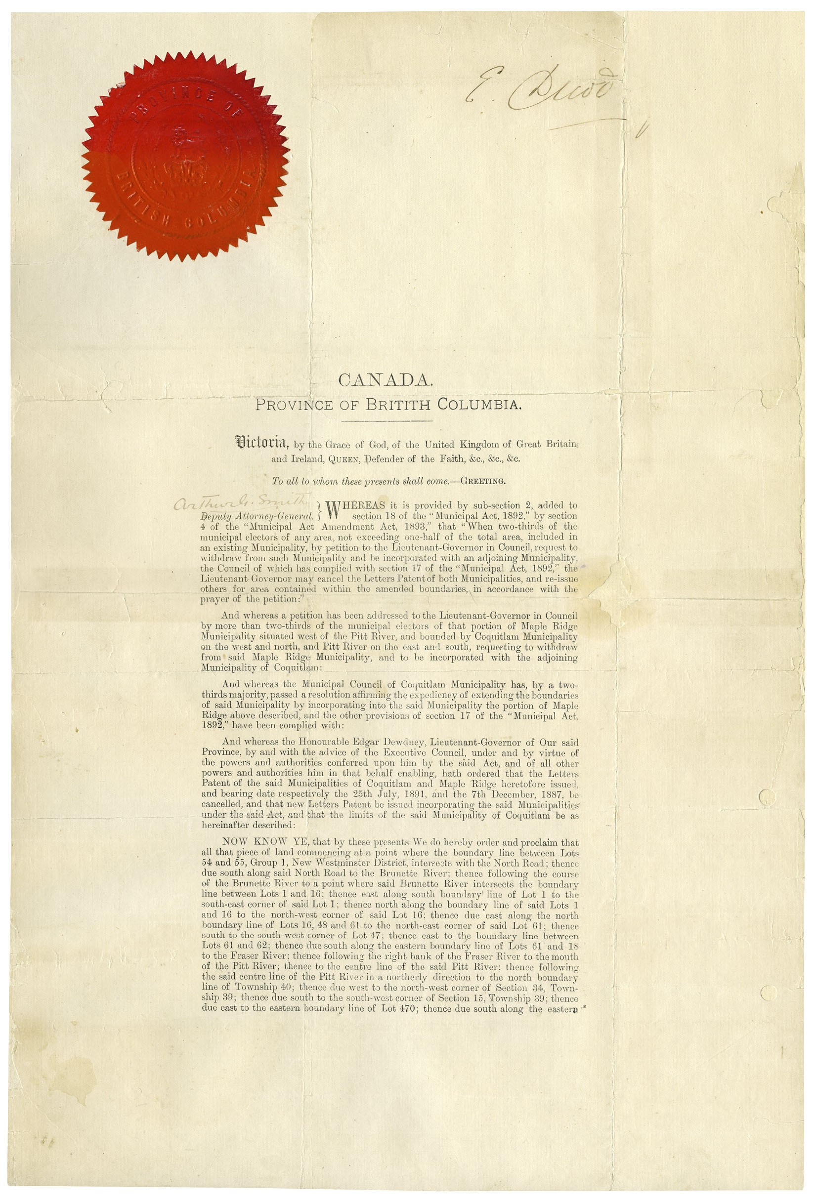 In 1894, a two-thirds majority of the residents of the western portion of the Maple Ridge Municipality petitioned to join the Corporation of the District of Coquitlam. This request was granted and new Letters Patent were signed on May 22nd, 1894.