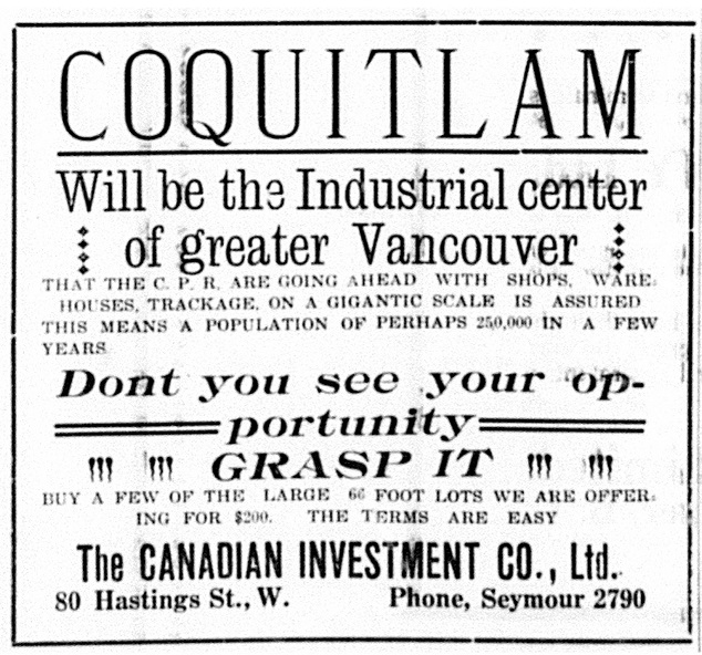 By the early 20th century, excitement was growing about Coquitlam’s potential. From 1911 to 1914, hundreds of ads appeared in the local newspaper encouraging investors to buy land, promising that Coquitlam was to be the industrial centre of greater Vancouver.