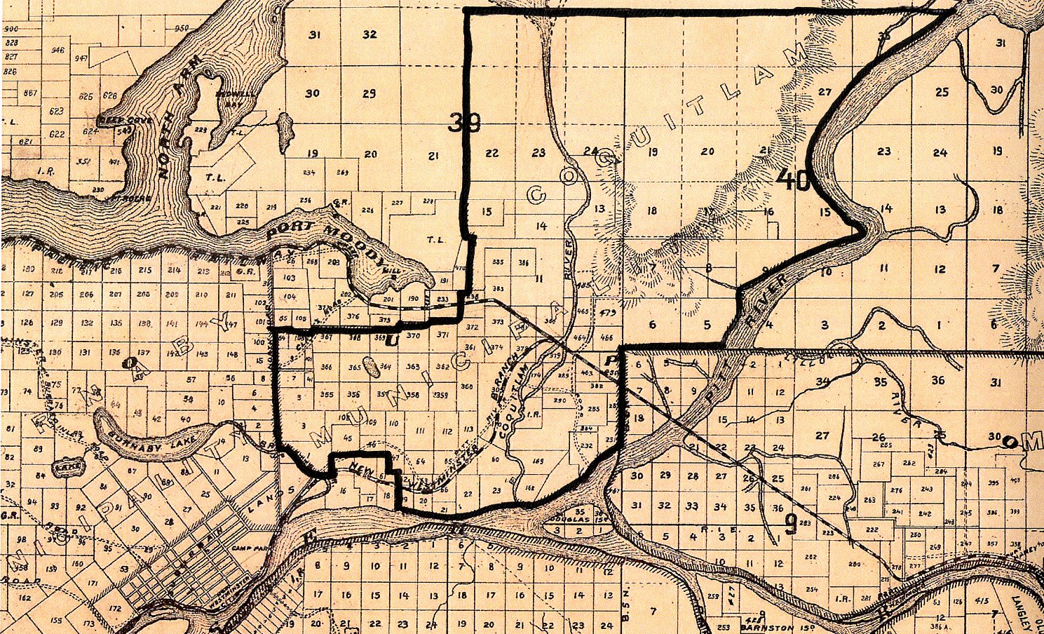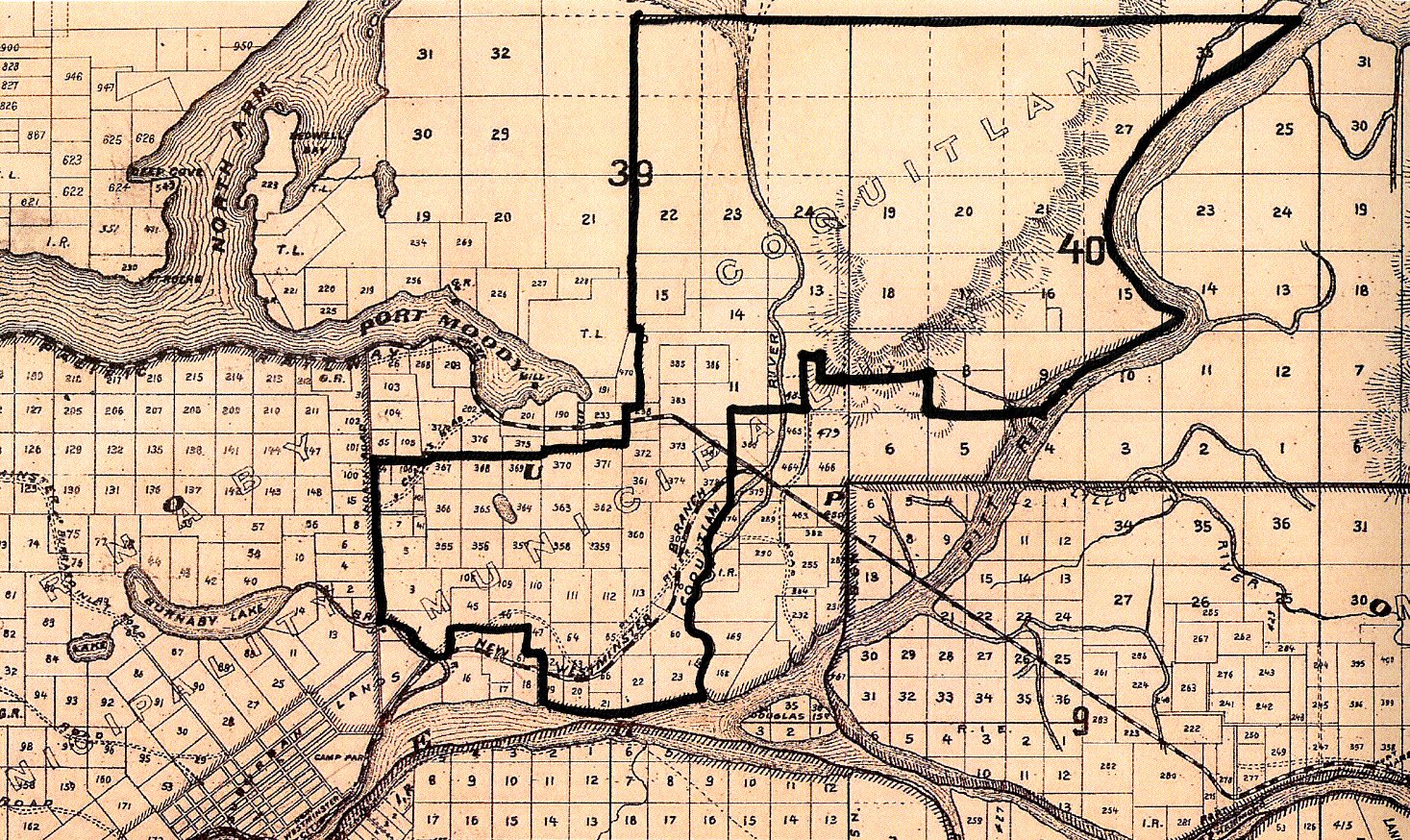 Coquitlam’s original boundaries have been drawn on this map from 1892 using the descriptions found in the original Letters Patent.