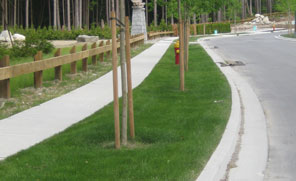 Roadside swales (JPG) are shallow grassed or vegetated channels that capture, detain and treat road runoff and convey larger flows. The captured water is infiltrated to the ground to recharge the water table and provide base flows for streams.