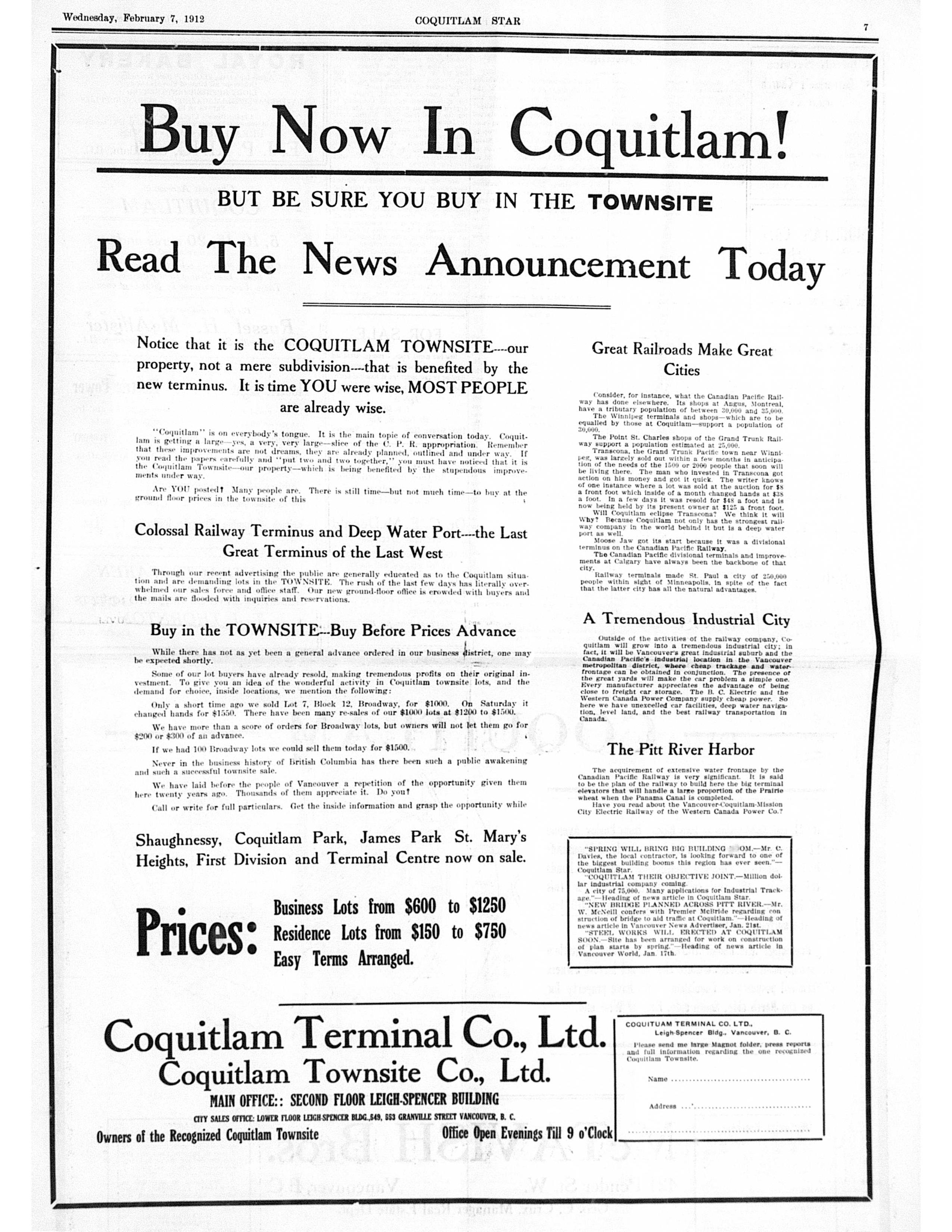 By the early 20th century, excitement was growing about Coquitlam’s potential. From 1911 to 1914, hundreds of ads appeared in the local newspaper encouraging investors to buy land, promising that Coquitlam was to be the industrial centre of greater Vancouver.