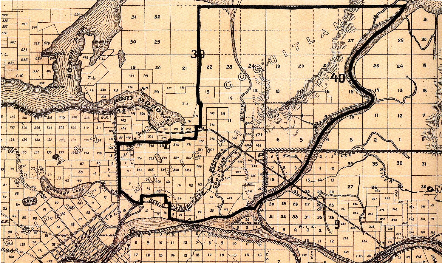 Coquitlam’s original boundaries have been drawn on this map from 1892 using the descriptions found in the original Letters Patent.